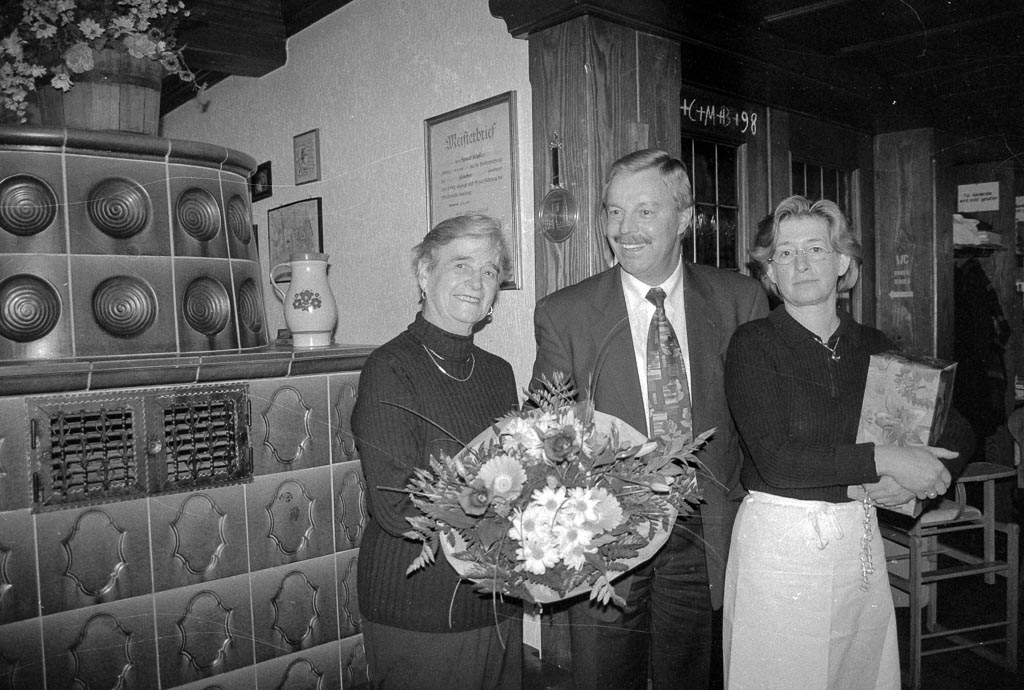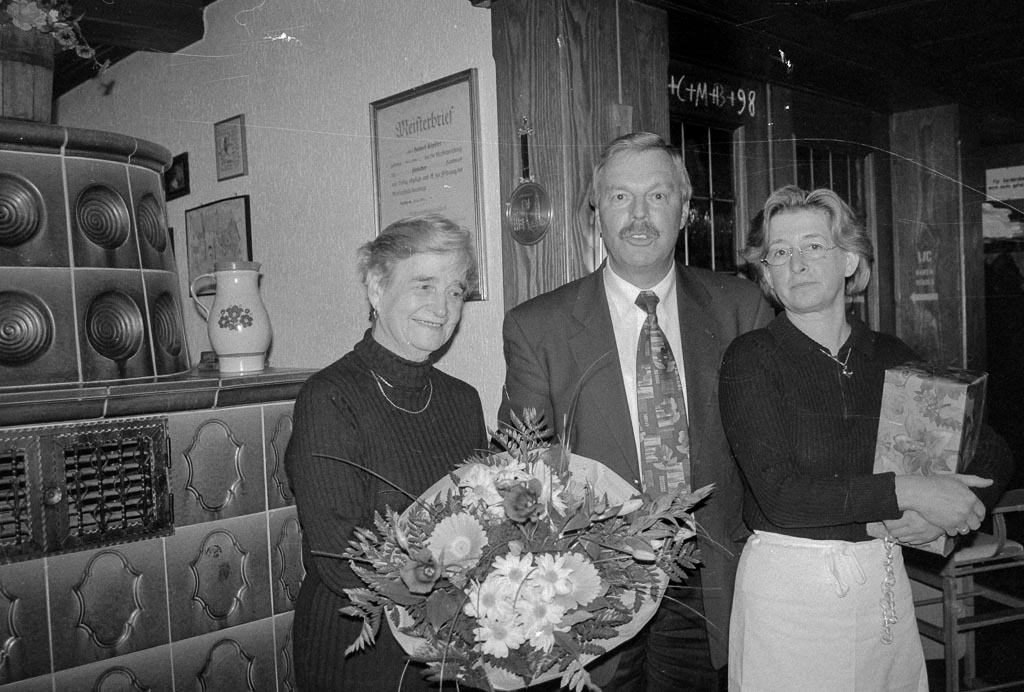 Der über der Eingangstür angebrachte Segen der »Sternsinger« verrät das Jahr, in dem dieses Foto entsteht: 1998. Seit 35 Jahren betreibt Rosa Köpfler (1926-2015) das Gasthaus »Ochsen« in Löffingen. Zu diesem Jubiläum wird sie gemeinsam mit ihrer Tochter Erika Köpfler geehrt. Ein großer Blumenstrauß und ein Geschenk werden überreicht – Zeichen der Anerkennung für jahrzehntelanges Engagement in der Gastronomie. Neben den beiden Frauen steht ein Mann im Anzug, vermutlich ein Vertreter des Hotel- und Gaststättenverbands.