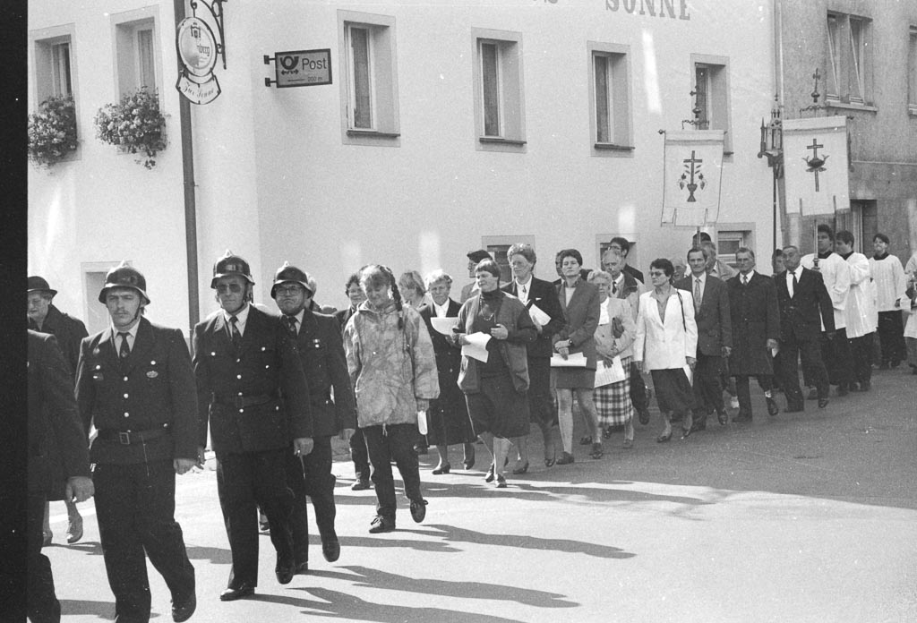 Feierlich setzt sich die Prozession in Bewegung. Von der katholischen Pfarrkirche St. Michael kommend zieht sie durch die Untere Hauptstraße – langsam, geordnet, getragen von Gebet und Gesang. Soben kommt der Zug am Gasthaus »Sonne« vorbei. Voran schreitet die Feuerwehr, die den Zug begleitet und ihm einen würdigen Rahmen gibt. Es folgt der Kirchenchor. Die Sänger*innen halten Notenblätter in ihren Händen. Dahinter schreitet eine Schar Ministrant*innen, die Kirchenfahnen tragen.