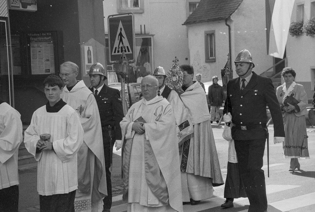 Im Mittelpunkt der Prozession steht die Monstranz mit dem Allerheiligsten. Getragen wird sie von Tutilo (Heinz) Burger (geb. 1965), begleitet von Stadtpfarrer Hermann Litterst (1929-2013). Über allem liegt eine besondere Spannung – eine Mischung aus Andacht und öffentlichem Bekenntnis des Glaubens. Auffällig ist das Spalier der Feuerwehrmänner, die mit gezücktem Säbel neben der Monstranz schreiten. Ein durchaus martialisches Auftreten im Namen Jesu Christi, der Gewaltlosigkeit und Feindesliebe predigte. Zugleich ist es ein eindrucksvolles Bild, wie weltliche Ordnung und religiöse Tradition ineinandergreifen.