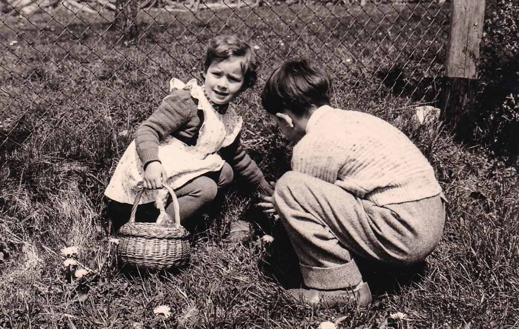 2 Fotos: Geschwister bei der Ostereiersuche am Alenberg, 1958