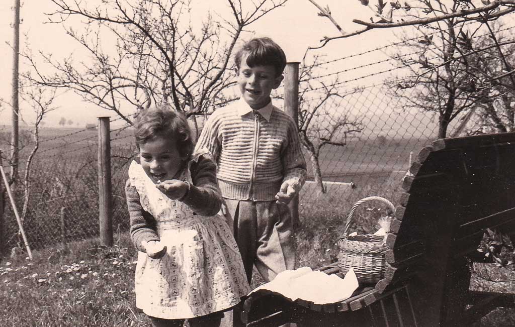 Große Aufregung liegt in der Frühlingsluft: Im Garten der Familie Rebholz am Alenberg sind zwei Kinder eifrig auf der Suche nach den versteckten Überraschungen des Osterfestes. Klemens Rebholz (geb. 1949) und seine kleine Schwester Cäcilie Rebholz (geb. 1953) durchstreifen den Garten zwischen Grasbüscheln und ersten Blüten.