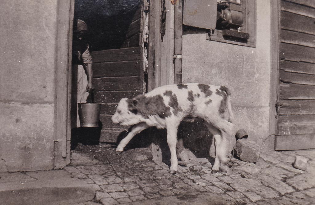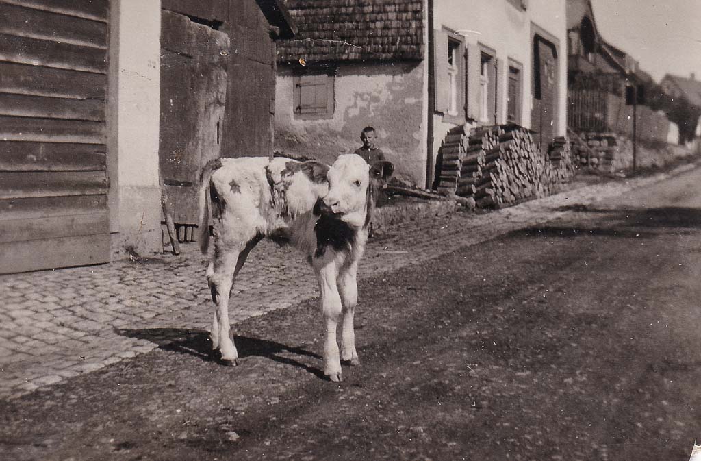Vorsichtig tritt das Kälbchen auf das Kopfsteinpflaster, hebt den Kopf und bleibt mitten auf der Dittishauser Straße stehen. Die Sonne scheint warm, der Moment gehört ganz ihm. Verkehr gibt es hier kaum. Das junge Tier ist gerade aus dem Stall des Hauses Hepting (Dittishauser Str. 7) getreten. Solche kleinen Ausflüge gehören zum Alltag. Straße und Hof gehen ineinander über, Menschen und Tiere teilen sich den Raum ganz selbstverständlich. Am gegenüberliegenden »Ratzer-Brunnen« wird das Vieh auch ab und zu getränkt. Im Hintergrund steht ein Junge und beobachtet die Szene – vermutlich Ewald Hepting (1933-2010). In der Stalltür ist eine Frau zu sehen, wohl seine Mutter Sofie Hepting (geb. Jonner, 1909-1995). Sie behält das Kälbchen im Blick. Nach ein paar Minuten ist der kleine Ausflug vorbei. Das Kälbchen dreht um und trottet zurück in den Stall.