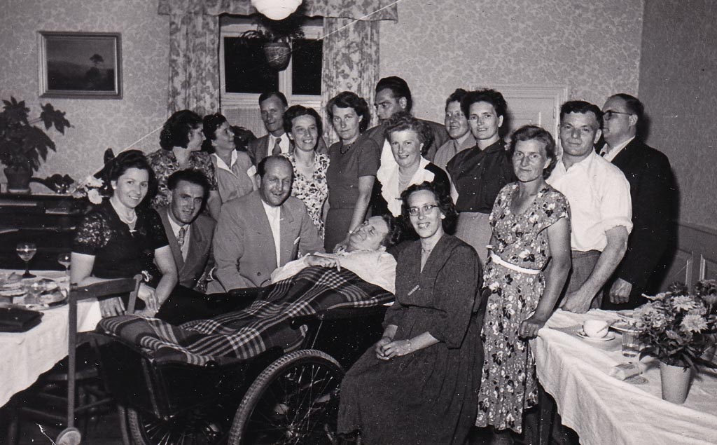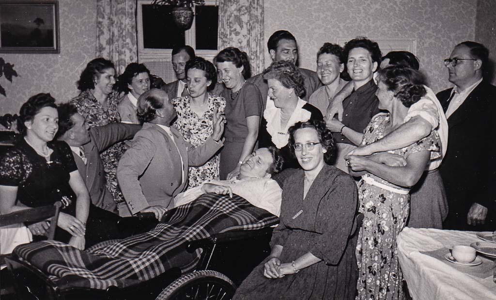 Mit dabei ist auch Heinrich (»Henner«) Jäger. Er liegt, in eine karierte Decke gehüllt, in seinem Rollstuhl. Seit einer schweren Rheuma-Erkrankung im Jahr 1933 ist er auf Unterstützung angewiesen. Dass seine ehemaligen Klassenkamerad*innen ihm die Teilnahme am Klassentreffen ermöglichen, verleiht dem Treffen eine besondere Note – obwohl es nicht besonders sein sollte: Ein Stück gelebte Inklusion, lange bevor der Begriff üblich wurde. Die fröhliche Stimmung und das enge Beisammensein der Gruppe spiegeln die Verbundenheit wider, die trotz der vielen Jahre geblieben ist.