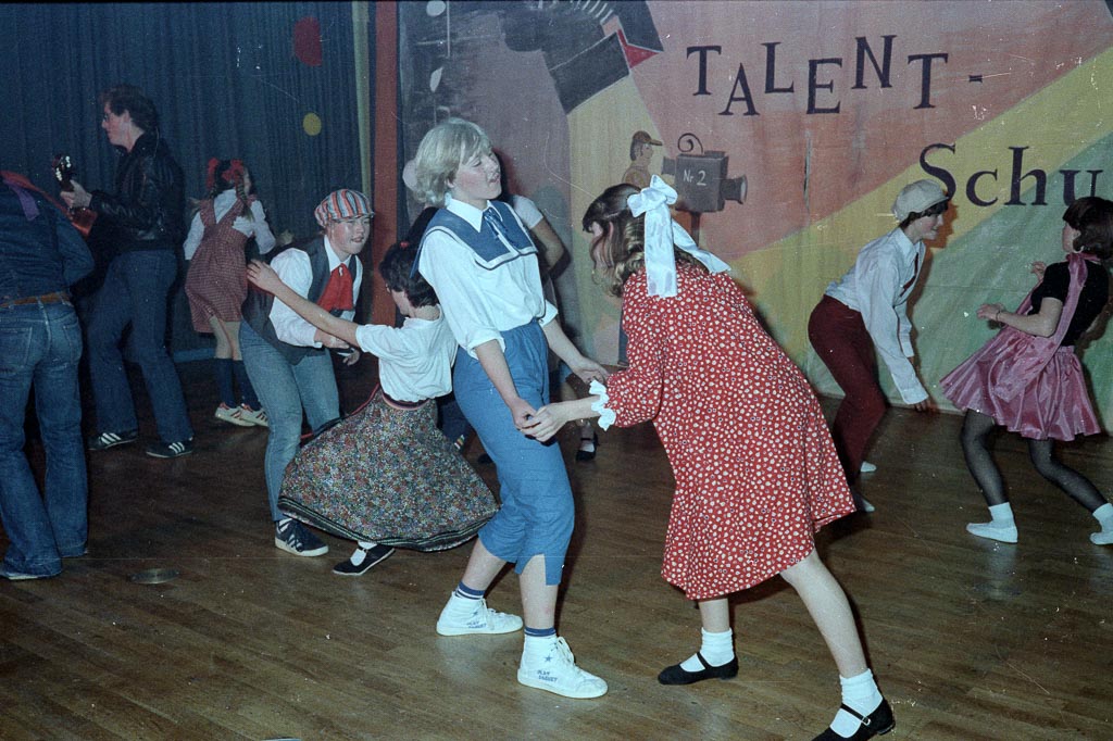 Auf der Bühne wechseln sich verschiedene Gruppen mit ihren Darbietungen ab. Zu sehen sind hier (vermutlich) Turnerinnen unter der Leitung von Ute Kaiser. Sie präsentieren eine »Skigymnastik nach herkömmlicher und moderner Art, à la Rock’n’Roll«, wie es später in der Lokalpresse heißt. In bunten Kostümen und mit schwungvollen Bewegungen tanzen sie über die Bühne und sorgen für viel Applaus im Saal.