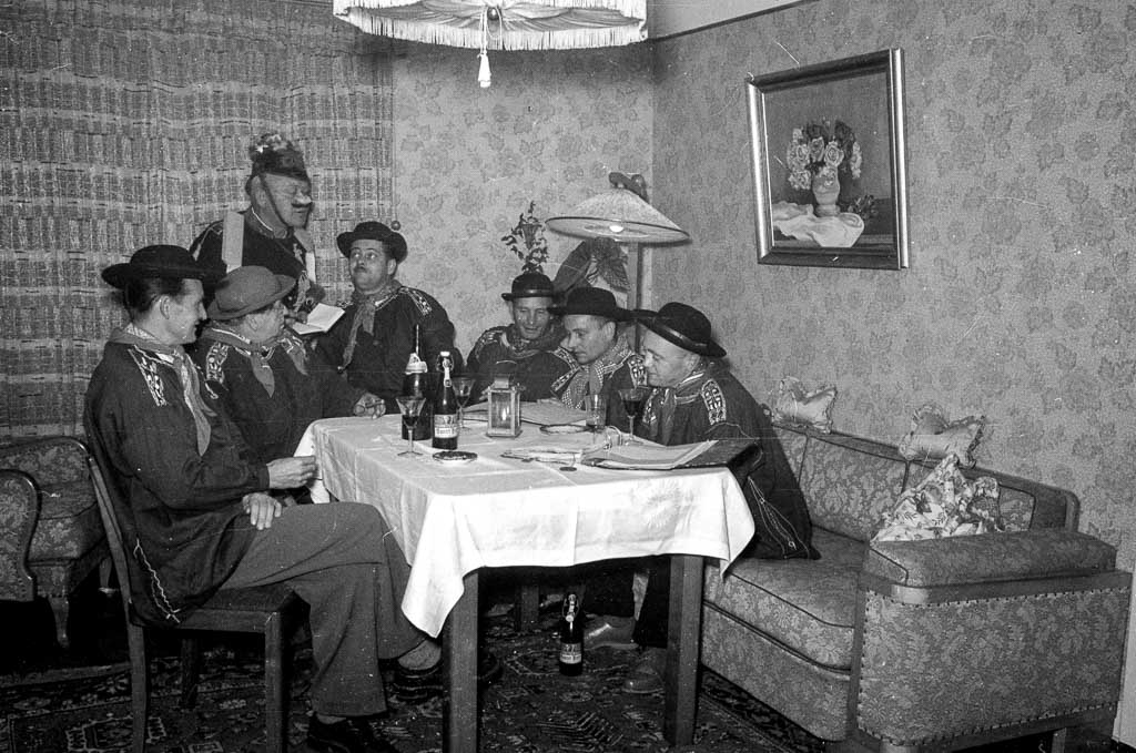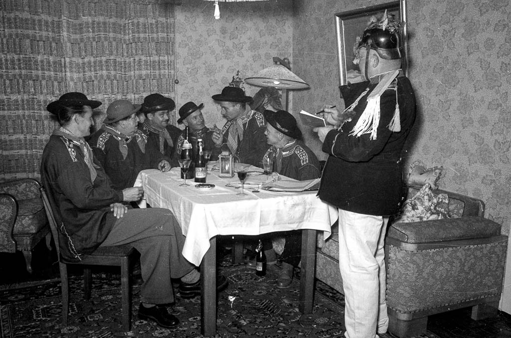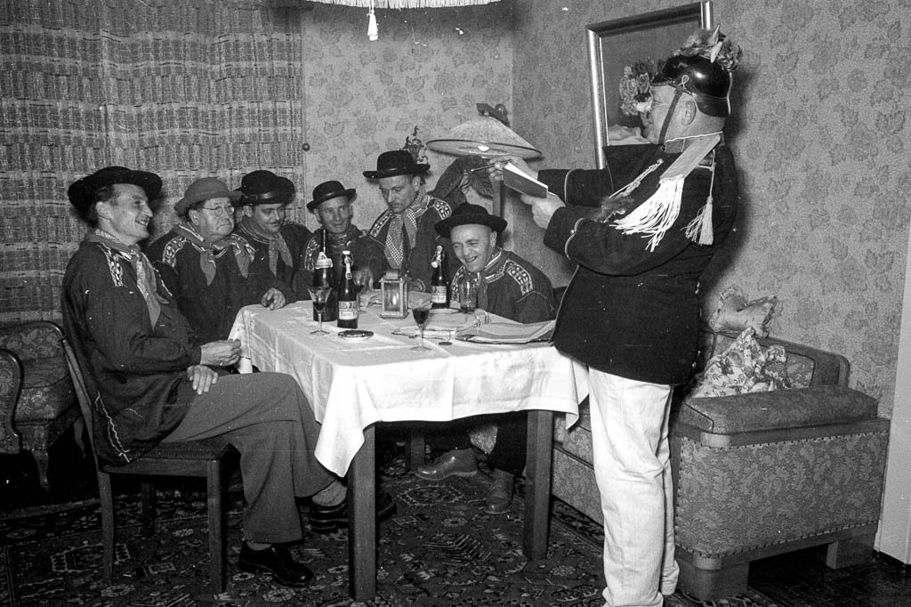 Rechts steht Narrenpolizist Fritz Göpper (1900-?), mit einem Notizblock in der Hand. Ob er die Namen der »Laternenbrüder« notiert, weil sie sich nicht an die närrische »Polizeisperre« gehalten haben? Oder ohne den Narrenvater zu einer konspirativen Sitzung zusammengekommen sind?