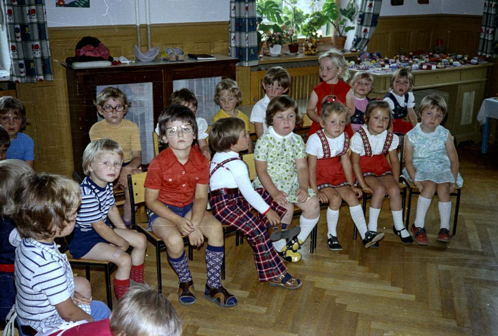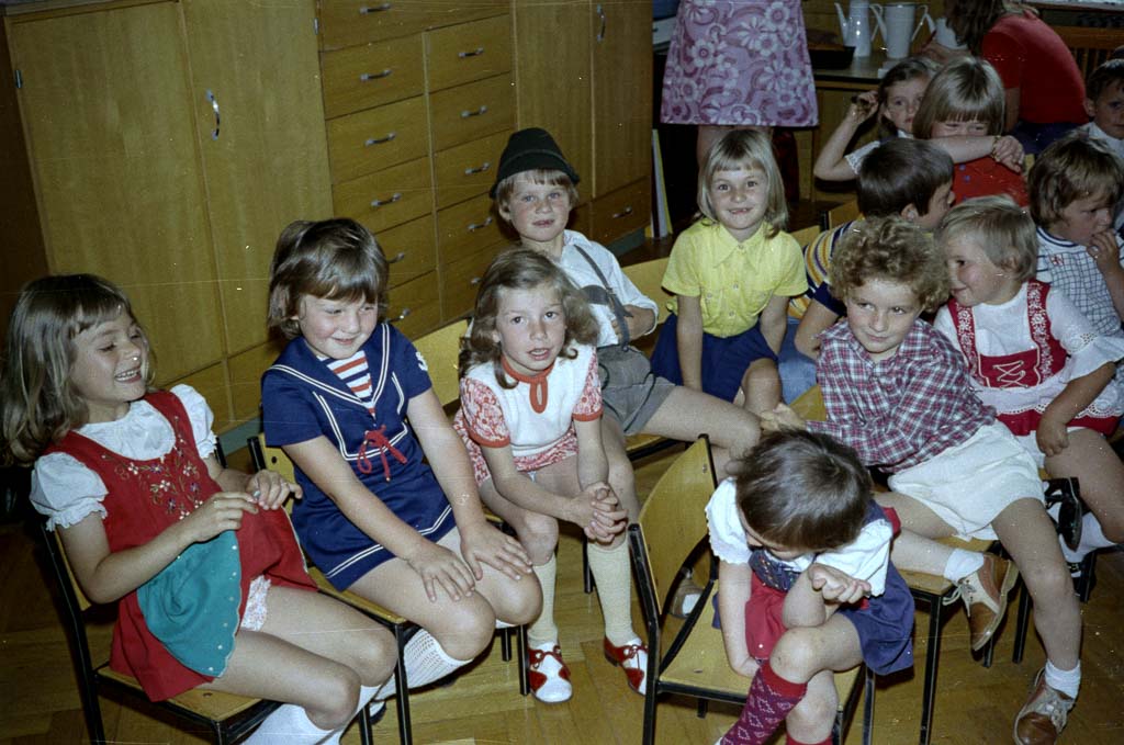 Dicht an dicht sitzen die Kinder auf kleinen Holzstühlen. Die Beine baumeln, die Hände liegen im Schoß oder spielen nervös mit Kleidern und Knöpfen. Einige schauen aufmerksam nach vorne – dorthin, wo gleich ein Theaterstück aufgeführt wird. Andere haben den Fotografen entdeckt und blicken neugierig direkt in die Kamera. Die Kinder tragen bunte Sommerkleider, karierte Hemden, Kniestrümpfe und Sandalen. Im Kindergarten in der Bahnhofstraße wird an diesem Tag ein Sommerfest gefeiert. Ein Theaterstück gehört dazu, und während ein Teil der Kinder auf der kleinen Bühne steht, bildet der Rest das Publikum – aufmerksam, neugierig und doch nicht immer ganz still.
