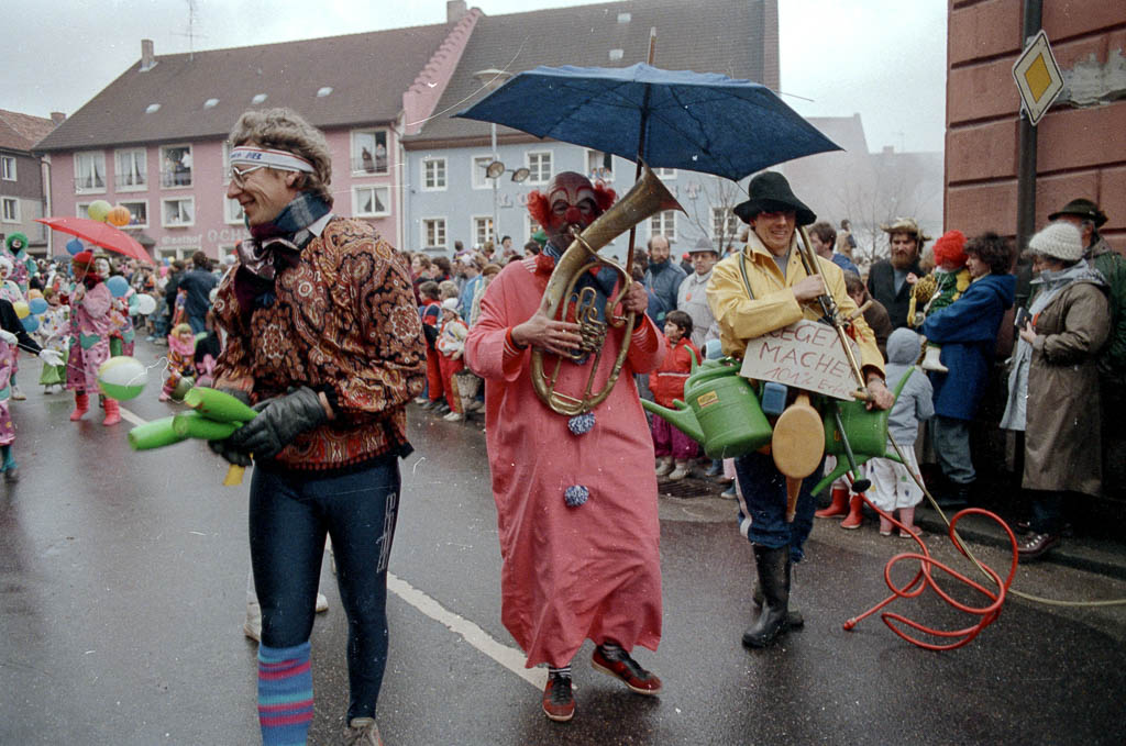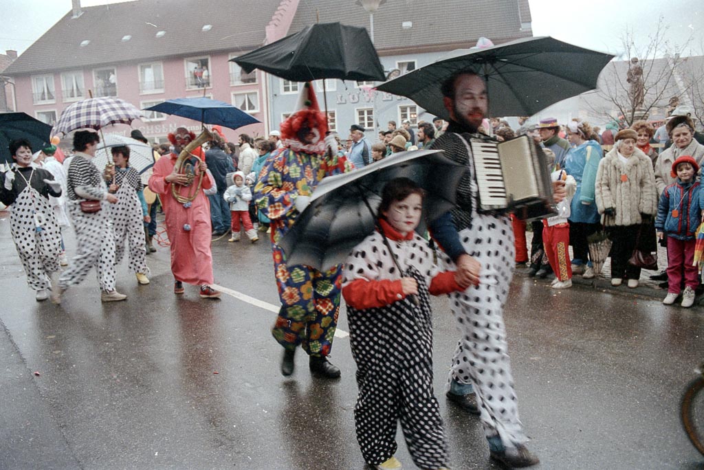 Die Gruppe zieht über den oberen Rathausplatz und passiert gerade das Rathaus. Das Wetter spielt allerdings nicht mit: Die aufgespannten Regenschirme sind keine bloßen Accessoires, sondern bitter nötig. Trotzdem harren die Zuschauer*innen am Straßenrand tapfer im Schmuddelwetter aus. So beteiligt sich die Gruppe als bunter Farbtupfer am närrischen Treiben – ein fröhlicher Kontrast zum grauen »Fasnet Mändig«, der für einen Moment fast vergessen lässt, wie ungemütlich das Wetter eigentlich ist.