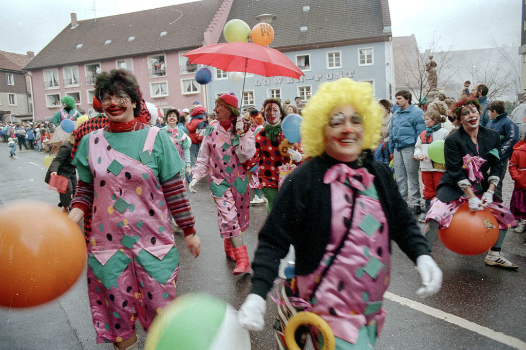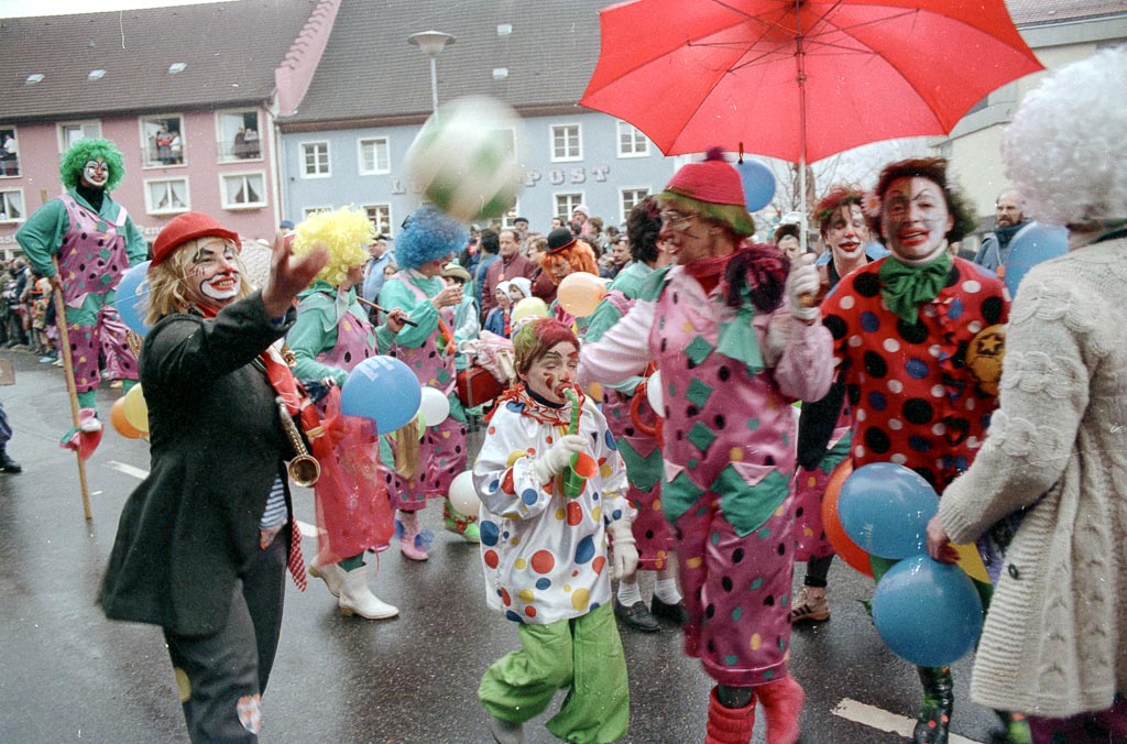 »Manege frei für Clowns, Akrobaten und Musikanten« lautet das diesjährige Fasnachtsmotto. Diese Gruppe – vermutlich aus dem Turnerbund – entscheidet sich nicht für eine der drei Varianten, sondern vereint gleich alles miteinander.