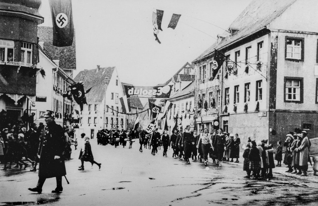 Es ist ein nasskalter Herbsttag. Die Fahrbahn der Unteren Hauptstraße glänzt vom Regen, am Straßenrand stehen Menschen in Mänteln. Ein organisierter Festzug zieht durch die Straße. An der Spitze marschiert eine Gruppe von Mädchen, vermutlich Angehörige des »Bund Deutscher Mädel« (BDM), der weiblichen Jugendorganisation des NS-Regimes. Hinter ihnen folgt die Stadtmusik, gefolgt von weiteren Formationen. Der Anlass ist das Erntedankfest, das im nationalsozialistischen Festkalender eine wichtige Rolle spielt. Solche Feiern dienen nicht nur der ideologischen Aufladung traditioneller Jahresfeste, sondern auch der öffentlichen Demonstration von Geschlossenheit und Gefolgschaft innerhalb der sogenannten »Volksgemeinschaft«.