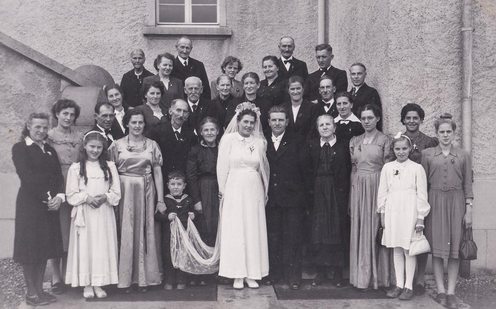 2.Reihe, v.l.n.r.: 1 Monika Wehinger (verh. Fesenmeyer, 1933-2021), 2 Theodor Wehinger (1921-2002), 3 Brautvater Theodor Wehinger, 4 Brautmutter Maria Wehinger (geb. Gut), 5 Anna Schelling (geb. Kuster, 1919-2010), 6 Anna Wehinger (verh. Vogelbacher, geb. 1937)