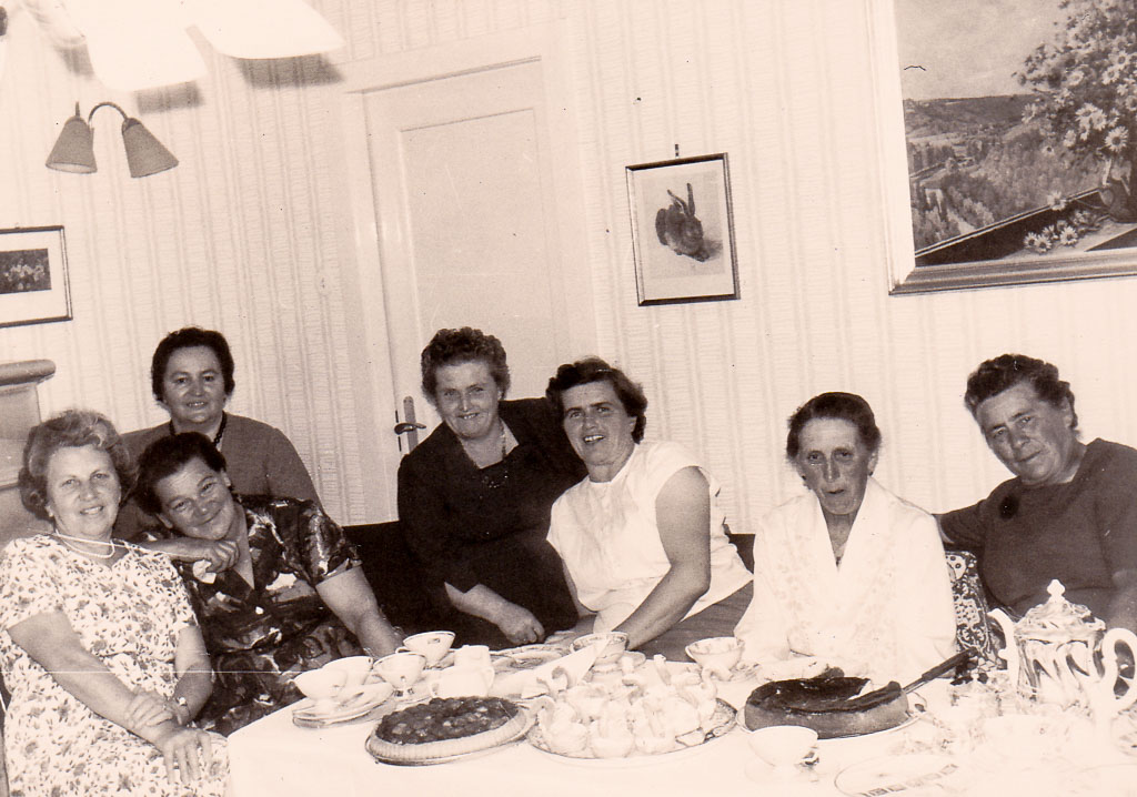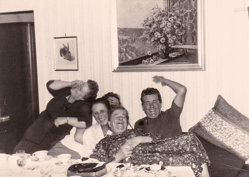 Doch schon wenig später hält sich niemand mehr an förmliche Zurückhaltung. Aus dem ernsten Gruppenbild wird eine Szene voller Gelächter: eine der Frauen liegt halb über den Schoß der anderen, Köpfe fallen einander an die Schulter, Hände werden vor Lachen vors Gesicht geschlagen. Es ist ein ausgelassenes, fröhliches Durcheinander, das zeigt, wie vertraut diese Frauenrunde miteinander ist. Ein paar Stücke Kuchen, eine Tasse Kaffee und die richtige Gesellschaft reichen, um einen glücklichen Nachmittag zu erleben.