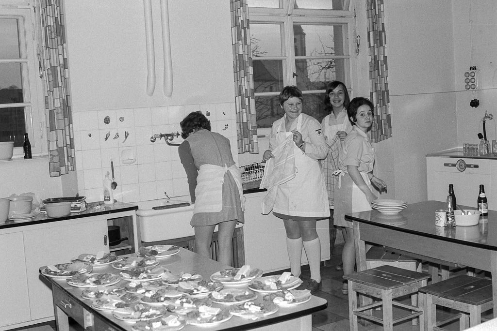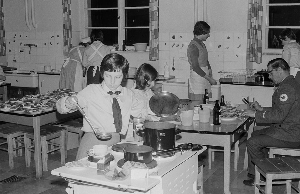 Auf den Tischen stapeln sich Teller, Brote und Aufschnitt, in der Luft liegt der Geruch von Wurst, Käse und frischem Brot. Vor allem Frauen, gekleidet in weiße Kittel und Schürzen, schneiden, schmieren, belegen und richten an – jede Handbewegung sitzt. In der Küche der Volksschule herrscht geschäftiges Treiben, Lachen und kurze Zurufe begleiten die Arbeit. Der Ortsverein des Roten Kreuzes bereitet sich auf den zweiten Blutspendetermin vor. Im Vorjahr hatte man am 8. Mai 1967 zum ersten Mal eine Spendenaktion für den Blutspendedienst Baden-Württemberg durchgeführt – mit großem Erfolg. Nun heißt es, die noch größere Zahl von Spender*innen zu versorgen. Denn wer sein Blut gibt, soll hinterher auch eine Stärkung bekommen: Brote mit Wurst oder Käse, dazu eine warme Suppe.