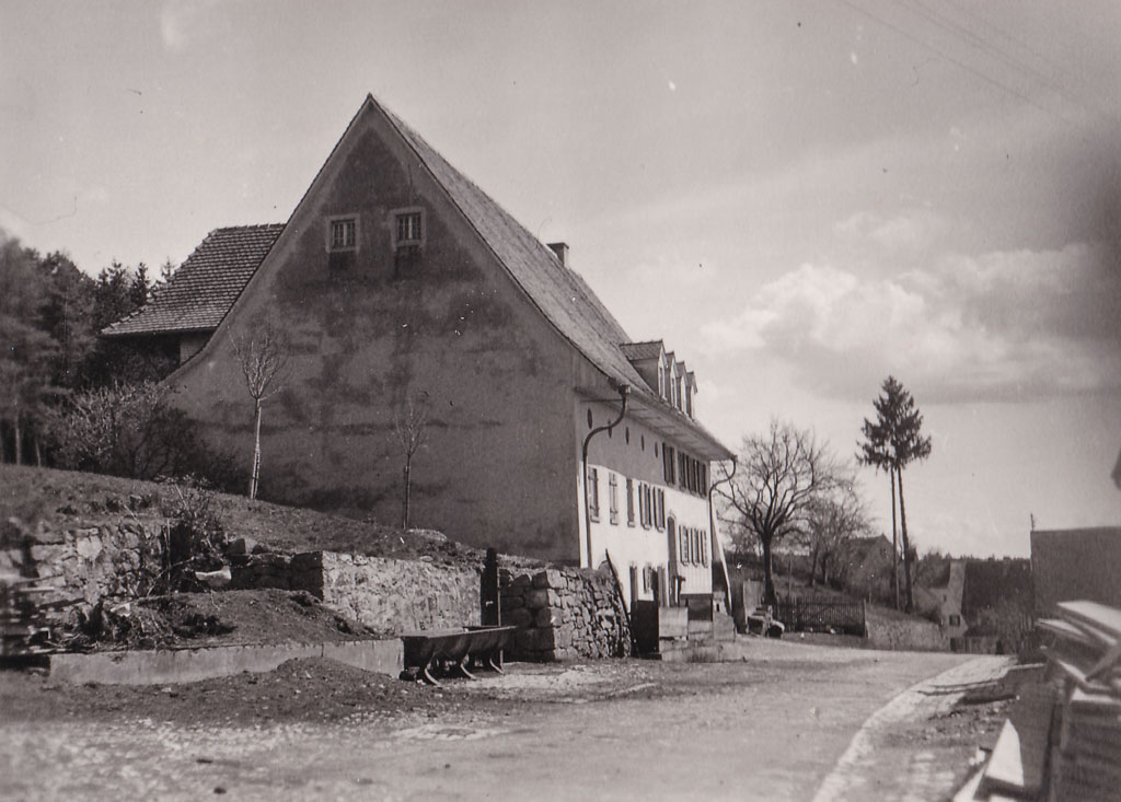 Vor dem 1925/26 erbauten »Gebertsaal« (Obere Hauptstr. 11) hat sich ein Brautpaar mit der Hochzeitsgesellschaft versammelt. Man steht dicht gedrängt, damit alle, eingezwängt durch die beiden geschmückten Nadelbäumchen links und rechts, auf das Gruppenfoto passen.
