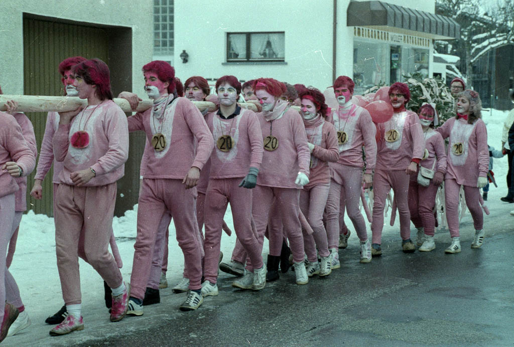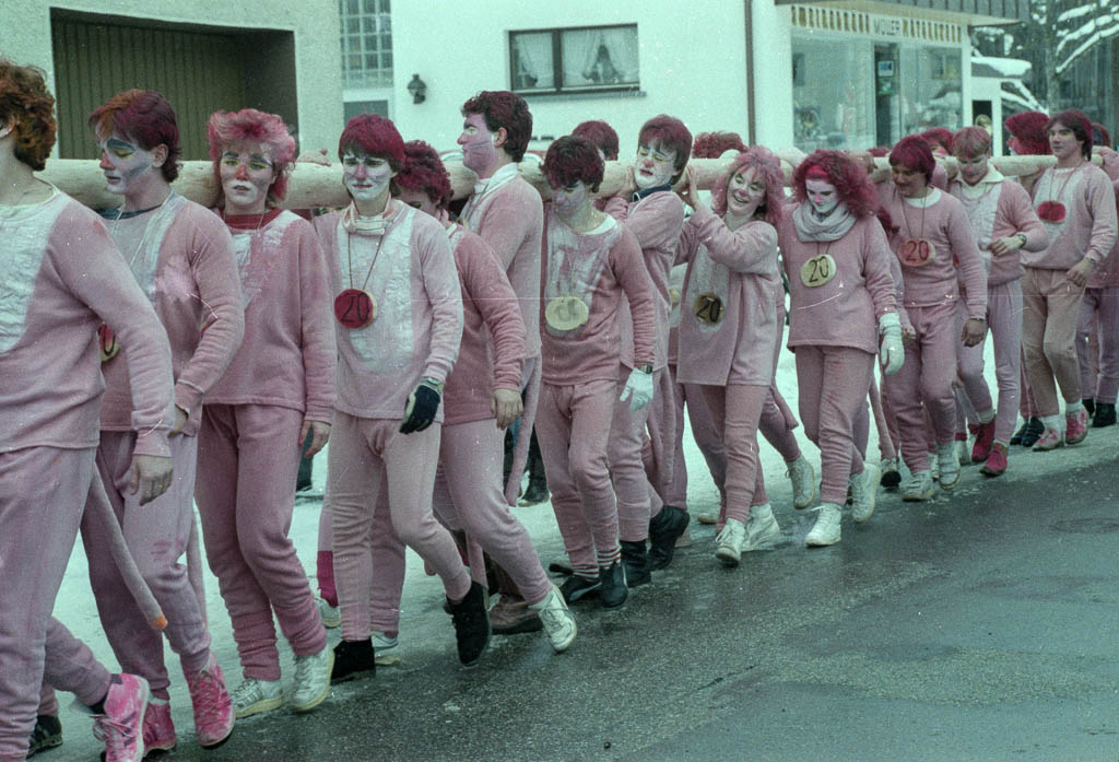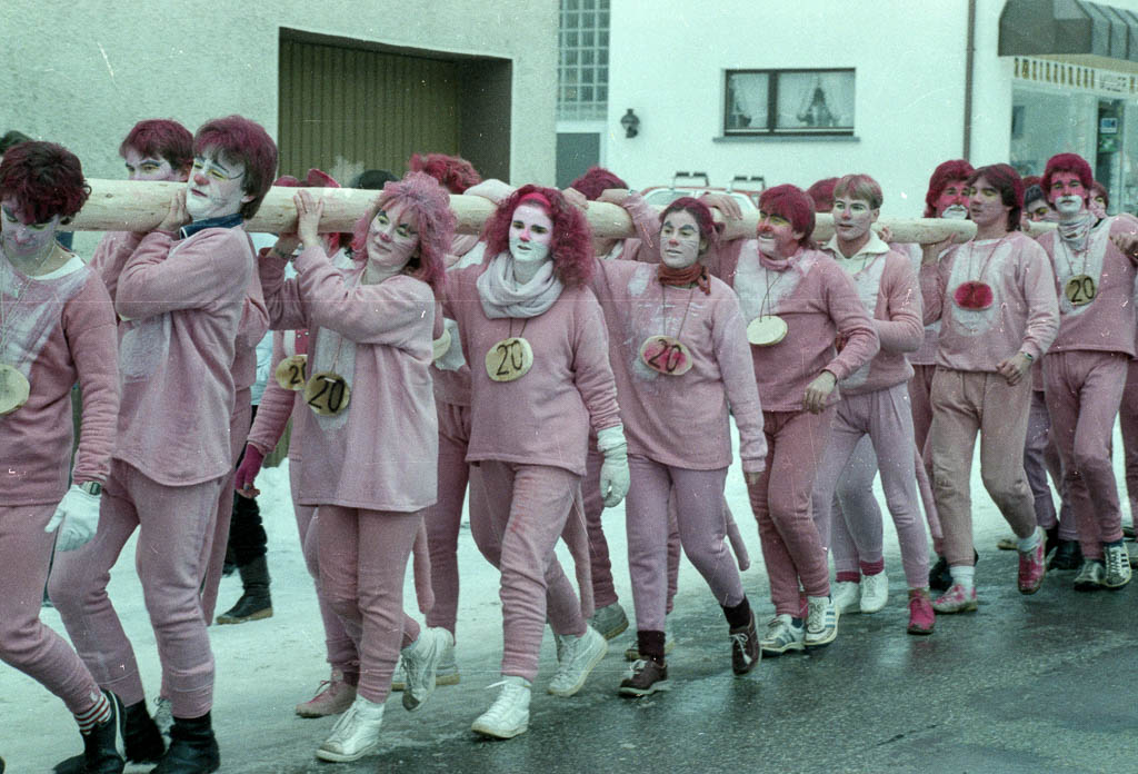 In diesem Jahr haben sich die jungen Frauen und Männer eine besonders einfallsreiche Verkleidung ausgesucht: Sie sind in die Rolle des »rosaroten Panther« geschlüpft – jener kultigen Figur aus Film und Fernsehen. Ganz in Rosa gekleidet, mit geschminkten Gesichtern und gefärbten Haaren ziehen sie lachend durch die Straße – ächzen aber auch ganz schön unter der Last des Narrenbaumes.