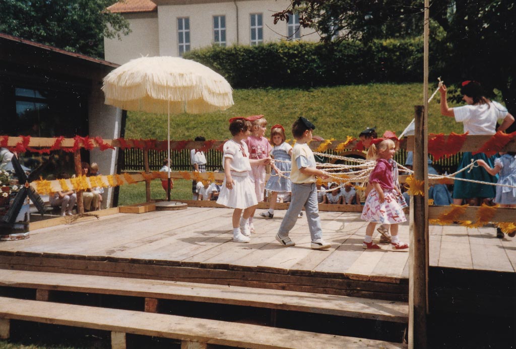 Im Kindergarten wird gefeiert. Auf einer kleinen Holzbühne tanzen Kinder im Kreis um ein Geflecht aus Seilen – ein Bändertanz, bei dem sich die Stränge nach und nach umeinander winden. Die Kinder heben die Arme, drehen sich und folgen aufmerksam den Anweisungen der Erzieherin. Sie halten konzentriert die Seile fest und bewegen sich im Rhythmus. Noch ist das Geflecht ungeordnet, doch mit jeder Runde entsteht langsam ein Muster.