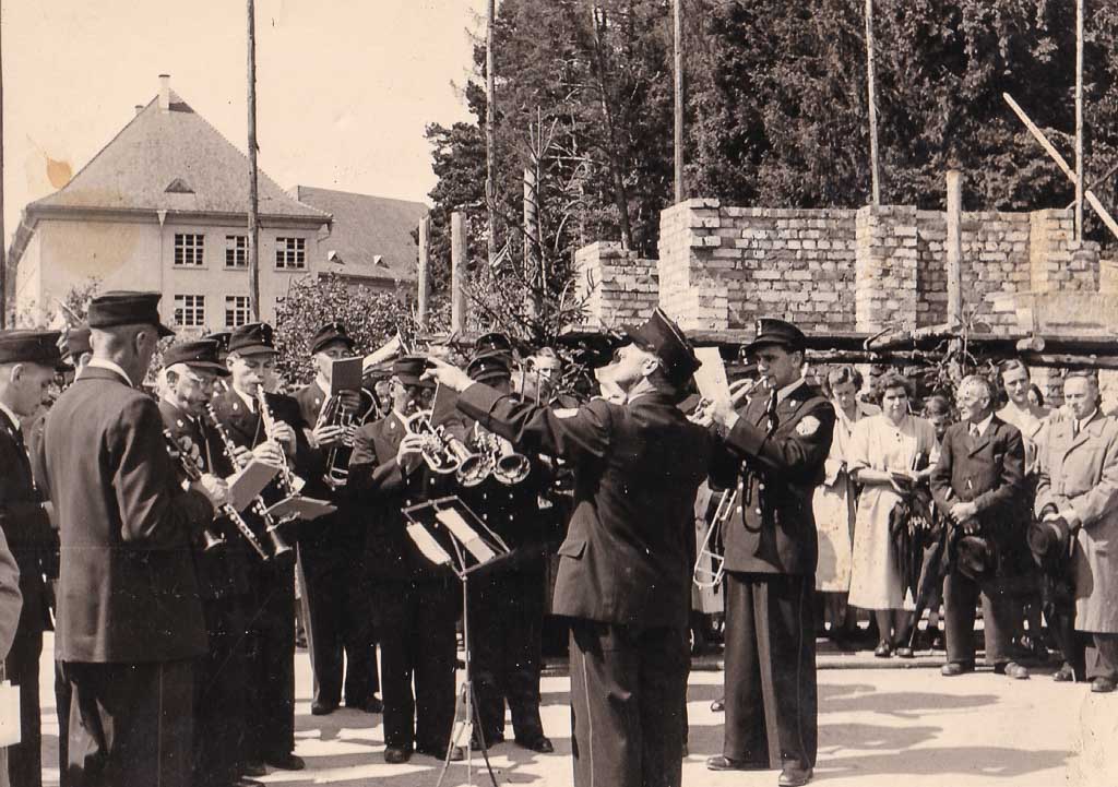 Im Mittelpunkt steht die Stadtmusik. Der Dirigent hat die Arme erhoben, die Musiker setzen zum Spiel an: Klarinetten, Trompeten und Hörner glänzen im Sonnenlicht. Mit feierlichen Klängen umrahmen sie die Grundsteinlegung der evangelischen Kirche am 19. Juli 1953, dem 7. Sonntag nach Trinitatis. Es ist ein besonderer Moment für die evangelische Gemeinde, die hier ihr eigenes Gotteshaus erhält.