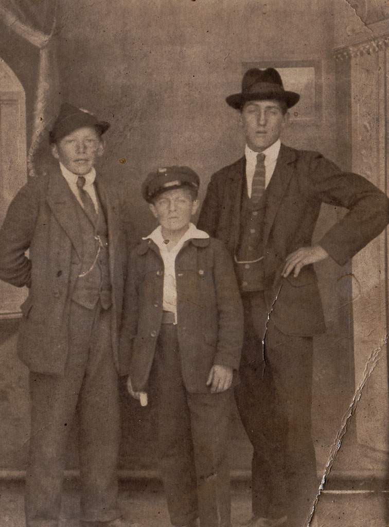 Drei Jugendliche stehen nebeneinander und blicken ernst in die Kamera – so ernst, wie es sich für ein ordentliches Porträtfoto gehört. Das Foto entsteht in einem Fotostudio, wohl in den frühen 1920er Jahren. Der Hintergrund mit Vorhang und gerahmtem Bild ist gemalt, die Bodenlinie markiert den Übergang zur Studiodekoration.