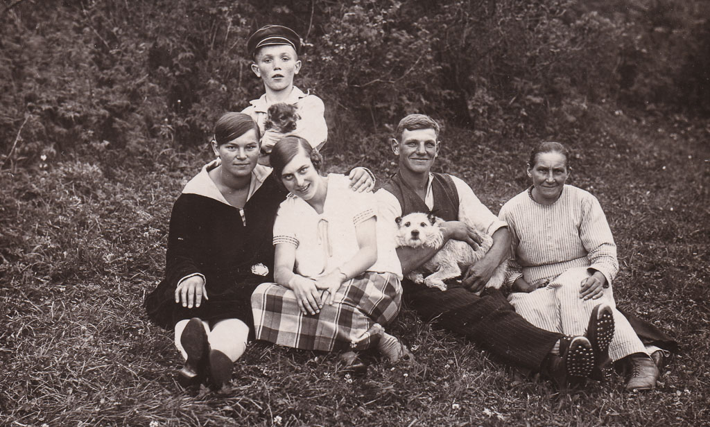 Ein Sommertag, irgendwo am Waldrand oder auf einer Wiese. Eine Familie hat sich für ein Erinnerungsfoto niedergelassen – nicht steif wie im Atelier, sondern ganz entspannt unter freiem Himmel. Zu sehen ist ganz rechts eine Frau, die wohl die Mutter der anderen ist. Neben ihr sitzen zwei junge Frauen, die sich aneinander lehnen und ihre Vertrautheit zeigen, sowie ein junger Mann, der einen Hund fest im Arm hält, ein struppiges Tier, das freundlich in die Kamera schaut. Dahinter ist ein kleiner Junge zu erkennen, der einen zweiten kleineren Hund in den Armen hält – offenbar das jüngste Familienmitglied auf vier Beinen.