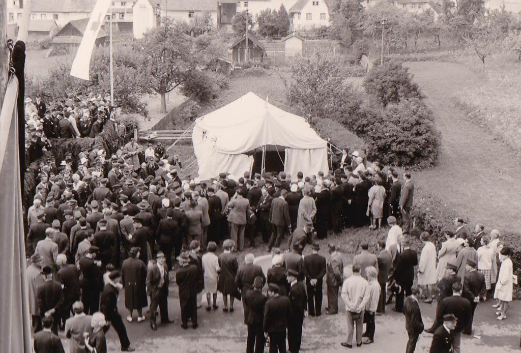 Rund um das Zelt hat sich eine große Menschenmenge versammelt. Männer und Frauen aller Altersgruppen verfolgen das Geschehen. Die weiße DRK-Fahne, die am linken Bildrand im Wind weht, unterstreicht den repräsentativen Charakter der Veranstaltung. Im Hintergrund erstreckt sich die damals noch unbebaute »Linde«-Wiese mit Obstbäumen, die zum gleichnamigen Gasthaus gehört. Wenige Jahre später wird auf diesem Gelände zunächst der Kindergarten und später auch die Realschule errichtet. Auch die Häuser in der Bittengasse und des Altstadtrings sind aus dieser Perspektive zu sehen.