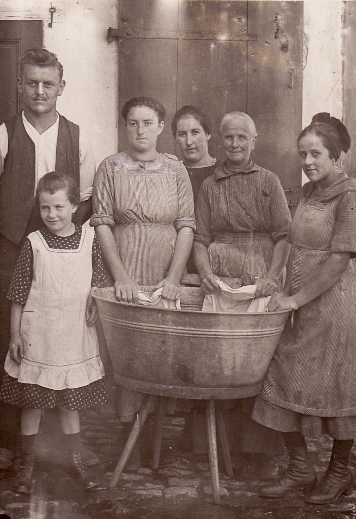 Heute ist Waschtag – und das bedeutet Schwerstarbeit. Im gepflasterten Hof steht der große verzinkte Waschtrog auf seinen vier Beinen. Darum gruppieren sich mehrere Frauen, die Ärmel hochgekrempelt, die Schürzen festgebunden. Ihre Hände greifen in das warme Seifenwasser, heben nasse Wäschestücke, wringen, reiben, tauchen ein – immer im gleichen Rhythmus, der viele Stunden füllt. Der Duft von Kernseife liegt in der Luft.