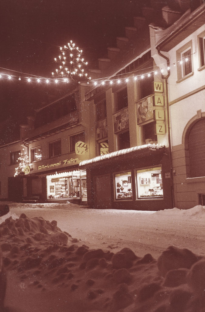 Die Schaufenster der Bäckerei Zahn (Kirchstr. 13) und des Eisenwarengeschäfts Walz (Kirchstr. 15) sind hell erleuchtet. Hinter den Scheiben präsentieren sich Waren und Auslagen. Das Licht spiegelt sich im Schnee und lässt die Kirchstraße beinahe feierlich wirken. Auch die Fassaden sind geschmückt. Ein beleuchteter Tannenbaum strahlt in der Dunkelheit. Das Städtchen zeigt sich von seiner ruhigen, behaglichen Seite – das Leben verlagert sich in diesen Tagen etwas nach innen.