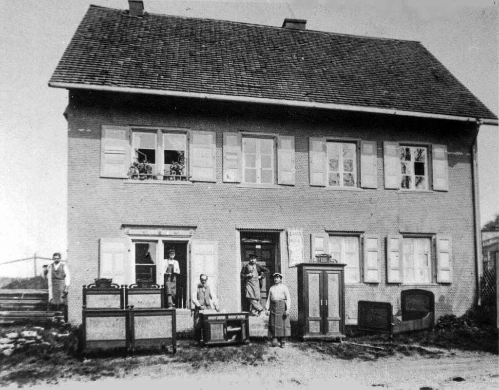 Nach dem Tod des Ehepaares Limb ging das Haus an die Schwägerin Cäcilia Ritter (1833-1904) über. Sie ist unverheiratet und führt das Anwesen weiter. Offensichtlich wird auch die Schreinerei fortgeführt. Das Foto zeigt Schreiner, Gesellen und Lehrlinge, die sich stolz mit den gefertigten Möbeln vor dem Haus aufstellen. Es ist ein selbstbewusstes Bild handwerklicher Arbeit – nicht im Inneren der Werkstatt, sondern nach außen getragen, sichtbar für die Öffentlichkeit.