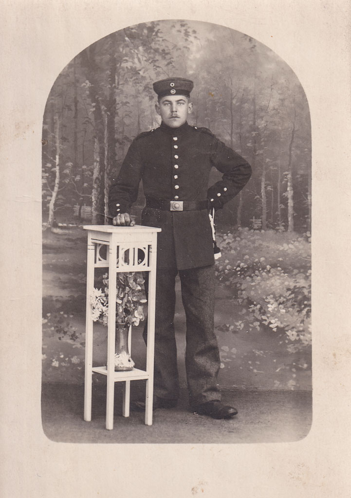 Das Porträt zeigt ihn in feldgrauer Uniform: ein hochgeschlossener Waffenrock mit blanken Knöpfen, dazu die Mütze mit Reichs- und Landeskokarde. Mit ernster Miene steht der junge Soldat vor einem gemalten Atelierhintergrund, der einen idyllischen Wald zeigt und dem Foto einen friedlicheren Rahmen verleiht. Seine rechte Hand ruht auf einem Holzpodest.