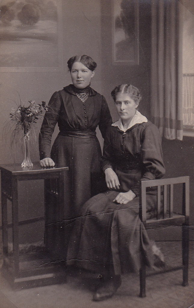 Die beiden Schwestern Maria Winterhalder (?-?) und Emma Winterhalder (verh. Hasenfratz, 1898-?) lassen sich im Fotostudio in Neustadt fotografieren. Eine steht neben dem kleinen Tisch, die andere sitzt auf dem Stuhl, die Hände sorgfältig abgelegt. Der gemalte Hintergrund, der Blumenstrauß in der Vase, die bewusst gewählte Haltung – alles folgt den Regeln der Atelierfotografie. Ein solcher Besuch ist nichts Alltägliches. Man kleidet sich gut, nimmt sich Zeit und weiß, dass dieses Bild bleiben wird.