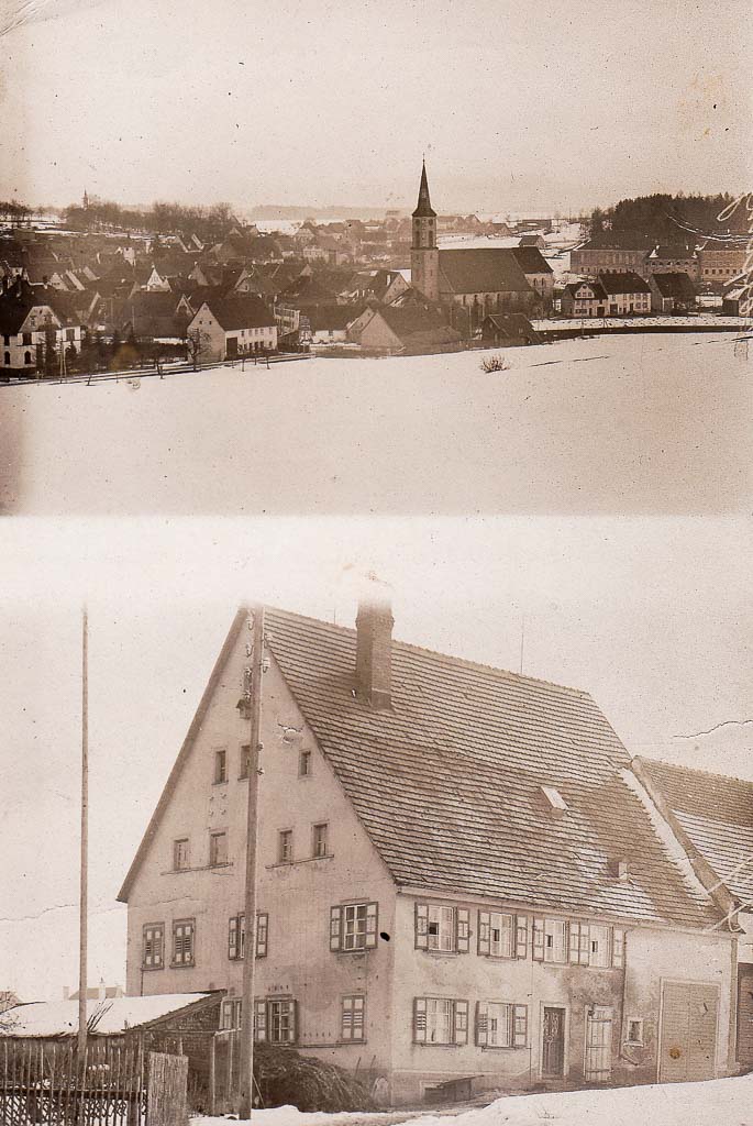 Mitte der 1920er Jahre fotografiert ein unbekannter Fotograf mehrere Häuser im Städtchen und verkauft die Aufnahmen zusammen mit einer Gesamtansicht in Form von Mehrbildkarten. Mehrere Hausbesitzer*innen erwerben diese Ansichten – so auch Familie Heiler, die im heutigen Pfarrweg wohnt, der damals noch einen anderen Namen trägt. Das landwirtschaftliche Anwesen auf der »Härte« gehört dem Landwirt und Schreiner Viktor Heiler (1868–1947) und seiner Ehefrau Franziska Heiler (geb. Laiz, 1868–1960). Die Aufnahme entsteht im Winter, Schnee liegt auf den Dächern und Feldern.