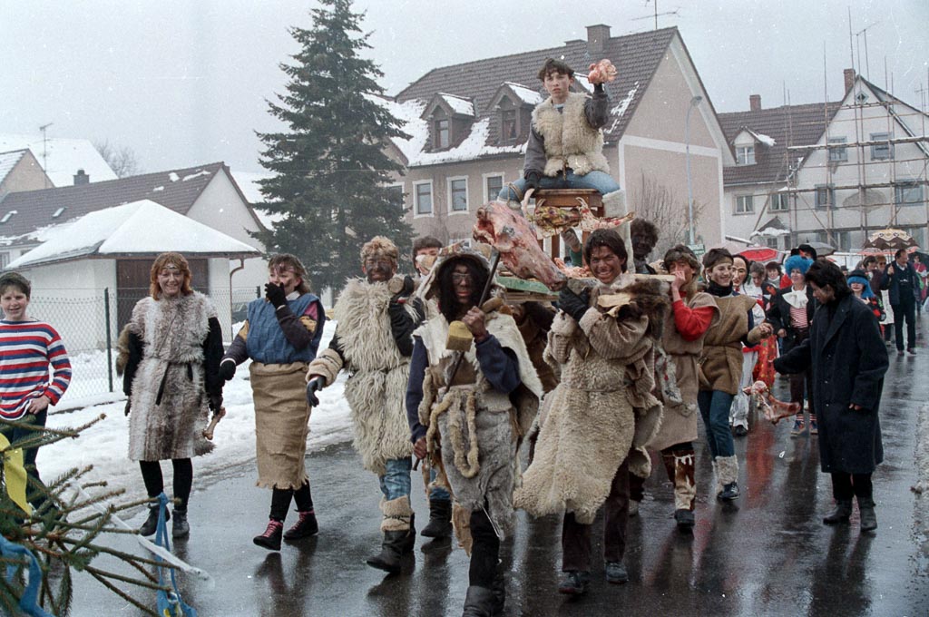 Eine Schulklasse der Realschule ist hier als Narrengruppe unterwegs und hat sich offensichtlich in die Urgeschichte katapultiert. In Fellwesten, mit Stricken um die Hüften, zerzausten Frisuren und mit Ruß geschwärzten Gesichtern ziehen sie durch die Maienlandstraße. Sie wirken wie eine Truppe aus dem Zeitalter der »Jäger und Sammler« – halb Steinzeit, halb Fasnachtsfantasie.