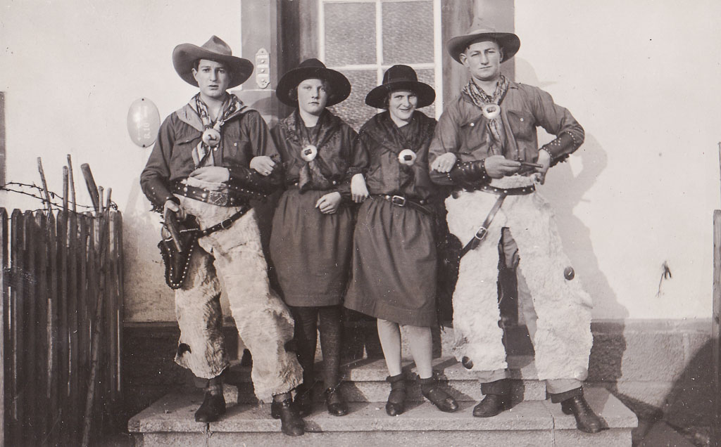 Vor der Haustür des Hauses Engesser (Demetriusstr. 4) hat sich diese Narrengruppe für ein Erinnerungsfoto aufgestellt. Zwei Cowboys stehen breitbeinig links und rechts, wie aus einem Westernfilm entnommen. Mit ihren großen Hüten, Halstüchern, breiten Gürteln und den auffälligen Fellhosen wirken sie kampfbereit und selbstbewusst. In ihren Händen halten sie »Käpselepistolen« – fest umklammert, als müssten sie jeden Moment zum Duell antreten.