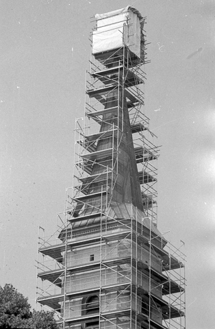 Jetzt, im Jahr 1990, schließt sich dieser Kreis erneut. Noch ist der Turm verhüllt, doch bald wird das Gerüst verschwinden und das Kreuz auf der Turmspitze wieder von weitem zu sehen sein.