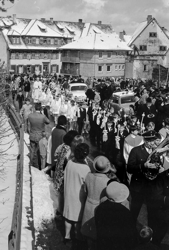 Nach dem Festgottesdienst in der katholischen Pfarrkirche St. Michael setzt sich der feierliche Zug der Erstkommunikanten in Bewegung. Die Stadtmusik führt die Prozession an, gefolgt von den Ministranten. Dahinter marschieren die Jungen in ihren dunklen Anzügen, jedes Kind eine Kommunionkerze in der Hand – sorgfältig verziert mit Schleifen. Ein paar Schritte dahinter folgen die Mädchen, ganz in Weiß gekleidet, mit Kränzchen im Haar (von denen manche verrutscht sind) und den gleichen festlich geschmückten Kerzen. Manche wirken aufgeregt, andere stolz oder ein wenig überwältigt vom großen Tag.