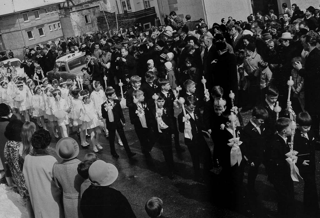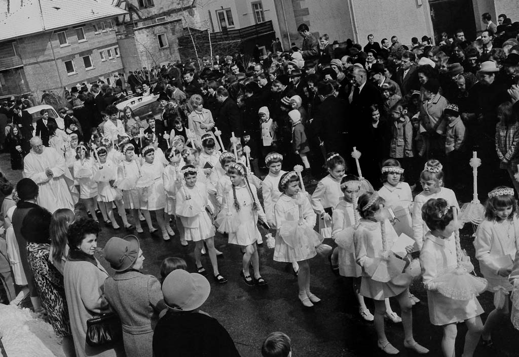 Am Straßenrand drängen sich Eltern, Geschwister, Großeltern und viele Gemeindemitglieder, um einen guten Blick zu erhaschen. Man sieht sonntägliche Hüte, Fotoapparate, erwartungsvolle Gesichter. Der Zug bewegt sich langsam die Seppenhofer Straße entlang in Richtung Kaplanei, wo der gemeinsame Abschluss stattfindet. Auch Stadtpfarrer Karl Weickhardt (1905-1977) ist zu erkennen, der die Erstkommunionkinder durch ihren Festtag begleitet.