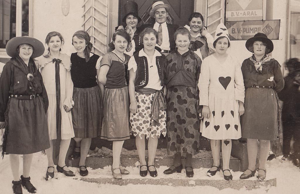 Vor der Haustür des Hauses Engesser (Demetriusstr. 4) hat sich diese Narrengruppe für ein Erinnerungsfoto aufgestellt. Zwei Cowboys stehen breitbeinig links und rechts, wie aus einem Westernfilm entnommen. Mit ihren großen Hüten, Halstüchern, breiten Gürteln und den auffälligen Fellhosen wirken sie kampfbereit und selbstbewusst. In ihren Händen halten sie »Käpselepistolen« – fest umklammert, als müssten sie jeden Moment zum Duell antreten.