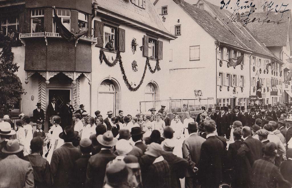 Der Rathausplatz wird eingerahmt vom 1909 erbauten »Stadtbau« (Demetriusstr. 1), in dem sich die Gewerbliche Fortbildungsschule befindet, und vom Haus Nägele (Rathausplatz 2), das der Kaufmannswitwe Lina Nägele (geb. Ott) gehört, sowie vom Postamt (Rathausplatz 3). Die beiden letzteren Häuser waren ursprünglich ein Gebäude, wie noch an der durchgehenden Dacheindeckung zu erkennen ist. Nur die Fassadengestaltung unterscheidet sich stark. Einst war es das Fürstenbergische Amtshaus und wurde von den Einwohner*innen respektvoll »Schloss« genannt. Nach der Auflösung des Fürstentums Fürstenberg kam Löffingen zum neu gegründeten Großherzogtum Baden und das Haus diente zunächst weiterhin als Dienstgebäude. Majestäten haben hier zwar nie verkehrt, aber als herrschaftliches Gebäude ist es die perfekte Kulisse für das närrische Treiben und den fiktiven »Besuch Seiner Majestät des Kaisers«.