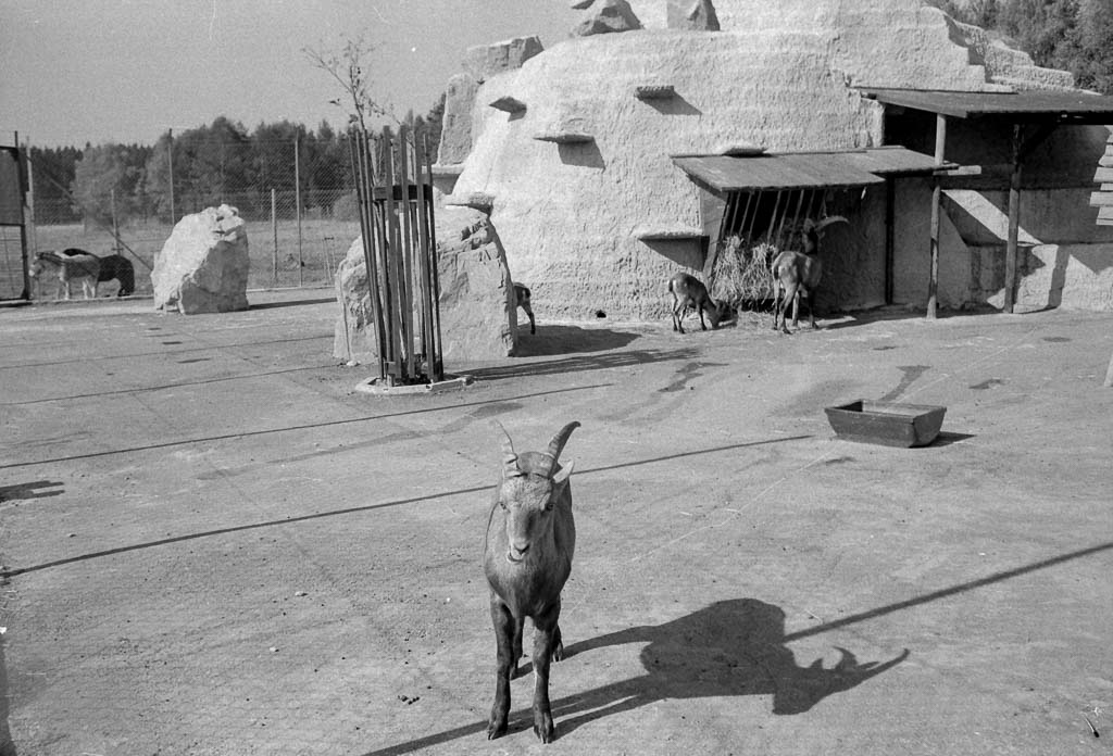 Das Gehege ist karg, eine Betonfläche, nur wenige künstliche Felsen und ein grob aufgeschichteter Hügel bieten den Steinböcken eine Möglichkeit zum Klettern. Viel mehr Abwechslung bleibt ihnen nicht. Die Anlage wirkt wenig artgerecht, doch im 1968 eröffneten Wildpark präsentiert man solche Gehege mit Stolz: Sie sollen den Besucher*innen einen ungehinderten Blick auf die Tiere ermöglichen und gleichzeitig die Pflege erleichtern.