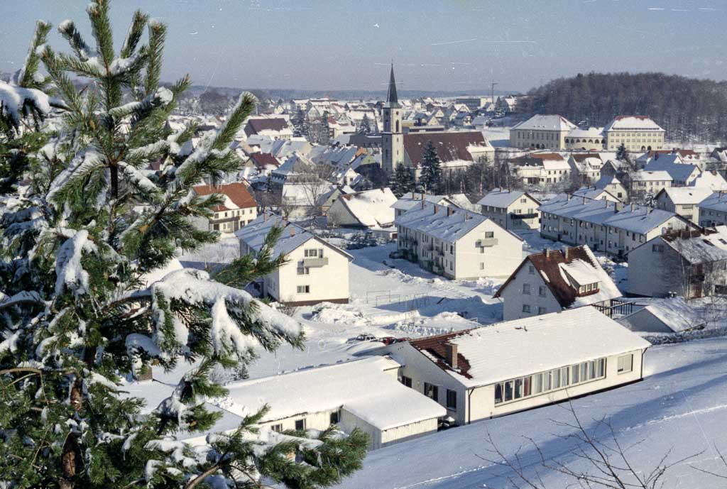 Vom Hang der »Wanne« aus öffnet sich der Blick über das winterliche Städtchen. Frischer Schnee liegt wie eine geschlossene Decke über den Dächern, Straßen und Gärten, dämpft Geräusche und lässt alles still werden. Im Vordergrund ragt eine verschneite Tanne und eine Kiefer ins Bild, ihre Äste schwer beladen, die den Blick des Fotografen bewusst rahmt. Sie verleiht der Ansicht eine weihnachtliche Note.