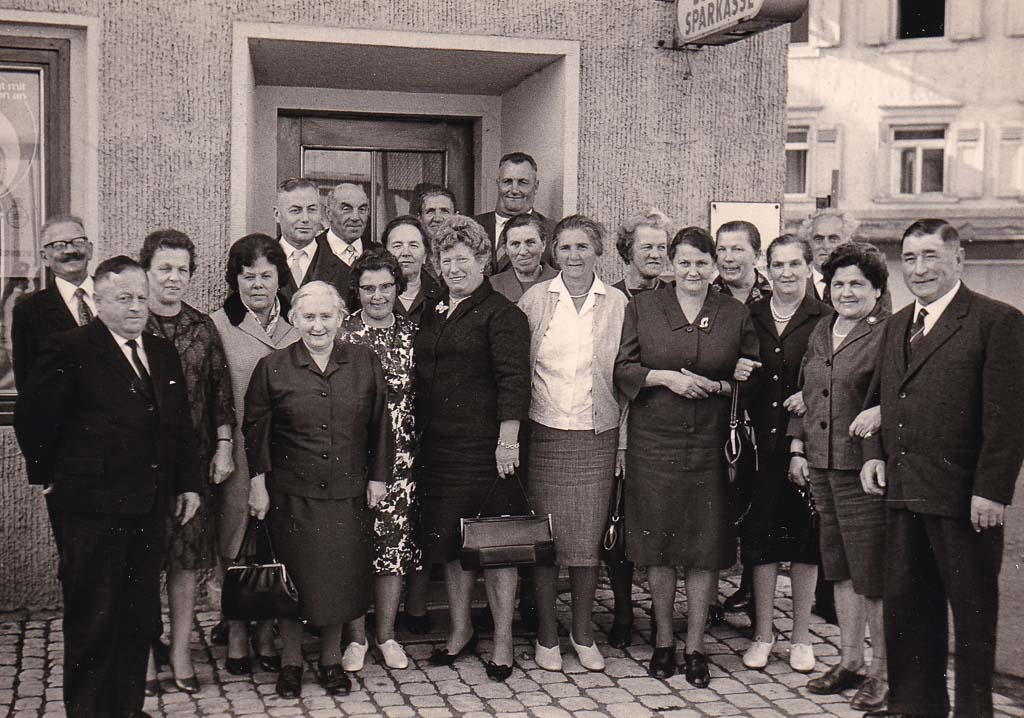 Die ehemaligen Schüler*innen der Geburtsjahrgänge 1905/06 versammeln sich zu einem Klassentreffen. Offenbar kehren sie in das Gasthaus »Adler« zu einem gemeinsamen Essen oder Umtrunk ein, denn das Gruppenfoto wird vor dem Eingang der Sparkassen-Filiale aufgenommen, die sich im Erdgeschoss desselben Gebäudes befindet.
