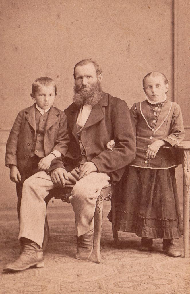 Der Mann trägt Vollbart und dunklen Rock, die Kinder sind ordentlich gekleidet und blicken ernst. Lächeln ist hier nicht gefragt. Ein Foto ist kein flüchtiger Schnappschuss, sondern ein Ereignis, das Bestand haben soll.