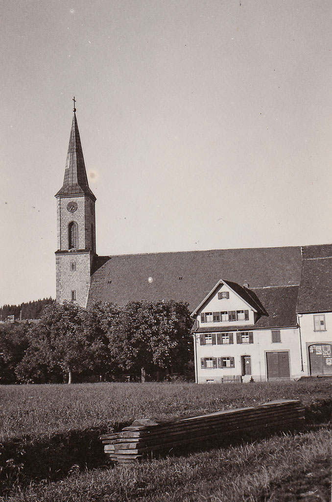 Der Blick fällt über eine Wiese hinweg auf das Haus Ganter (Seppenhofer Str. 1). Aufgenommen ist das Foto aus dem Bereich des heutigen Pfarrwegs – damals noch kein ausgebauter Straßenzug, sondern eher ein Wiesenrand, an dem sogar noch Bretter lagern. Das Haus gehört dem Schneidermeister Edmund Ganter (1879-1956) und seiner Ehefrau Maria Ganter (geb. Bader, 1881-1962). Auffällig ist der Giebel im Dachgeschoss: Er wurde erst nachträglich im Zuge eines Dachausbaus ergänzt und fehlt auf älteren Aufnahmen um die Jahrhundertwende noch.
