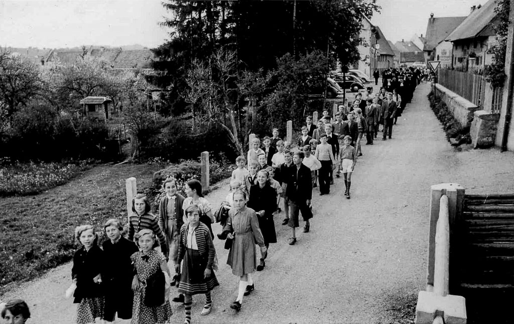 Die Feierlichkeiten haben bereits am frühen Nachmittag begonnen. Im bisherigen provisorischen Kirchenraum hält Pfarrer Herbert Wäldin (1912-1988) aus Bonndorf den Gottesdienst. Gegen 15 Uhr bricht die Gemeinde schließlich auf zur neuen Kirche, deren Grundstein erst im Juli 1953 gelegt worden war. Der Festzug wird vom Geläut der Glocken der katholischen Pfarrkirche St. Michael begleitet – ein schönes Zeichen des Miteinanders der Konfessionen. Gerade ziehen die Kinder am Haus Selb (Obere Hauptstr. 12) vorbei. Im Vordergrund ist die Miste des landwirtschaftlichen Anwesens zu sehen. Links öffnet sich die »Linden«-Wiese beim Gasthaus »Linde« (Obere Hauptstr. 10).