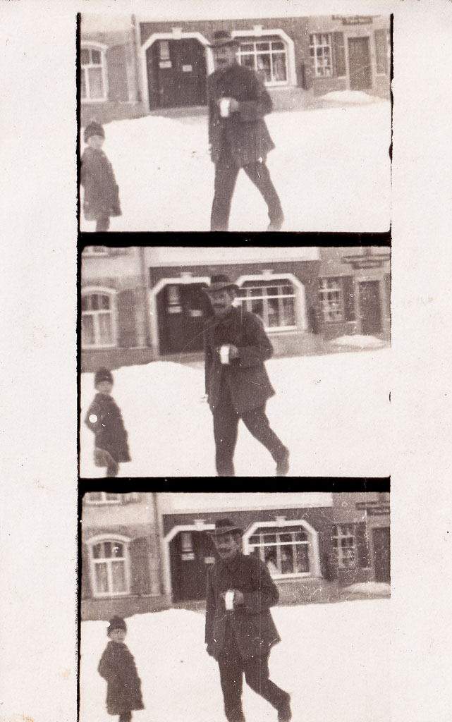 Während das Mädchen nahezu reglos am Rand steht, überquert Otto Ganter den unteren Rathausplatz, der verschneit ist. Die Abfolge der Bilder hält seine Bewegung Schritt für Schritt fest und verleiht der Aufnahme einen ungewöhnlich lebendigen Charakter.