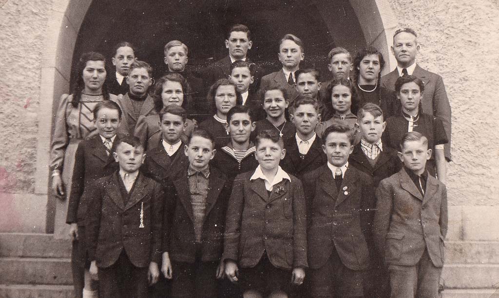 3.Reihe, v.l.n.r.: 1 Franz Rappenegger (1912-?), 2 ???, 3 ???, 4 Eugen Steidlinger, 5 ???, 6 Hedwig Wölfle (verh. Leithold, 1912-1994), 7 ???