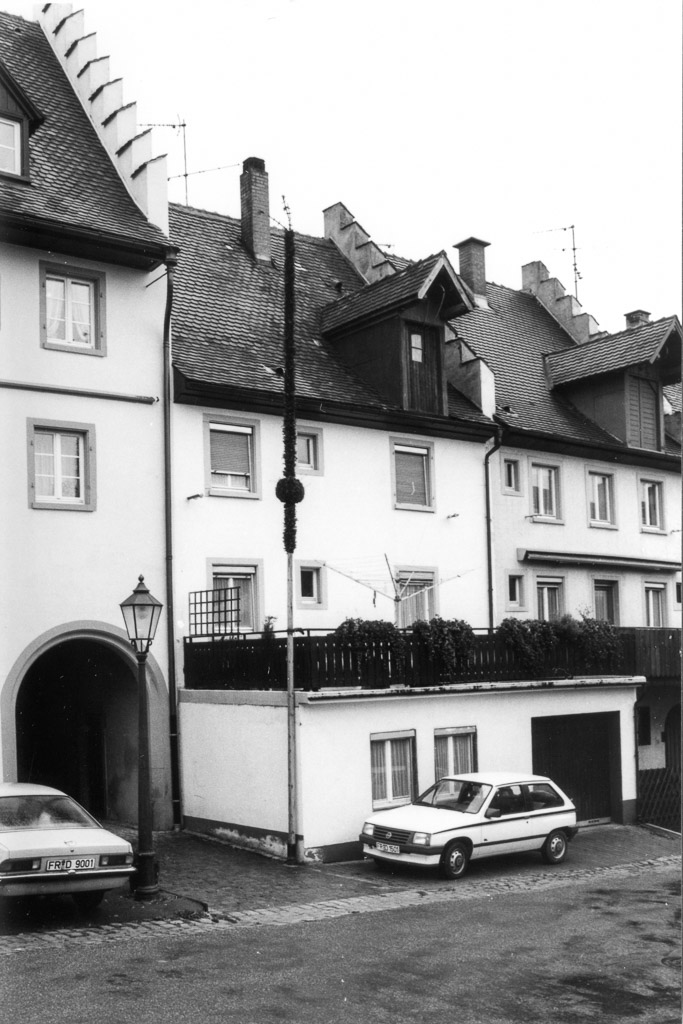 Von der Ringstraße aus zeigt sich die Rückseite des Hauses Scholz (Demetriusstr. 7), in dem der Schuhmachermeister Gerhard Scholz (1925-1998) mit seiner Ehefrau Anneliese Scholz (geb. Wehrle, 1924-2011) lebt. Neben seinem Beruf engagiert sich Gerhard Scholz in der katholischen Pfarrgemeinde – unter anderem als Meßmer. Es ist ihm daher ein besonderes Anliegen, jedes Jahr zum Palmsonntag einen »Palmen« anzufertigen.