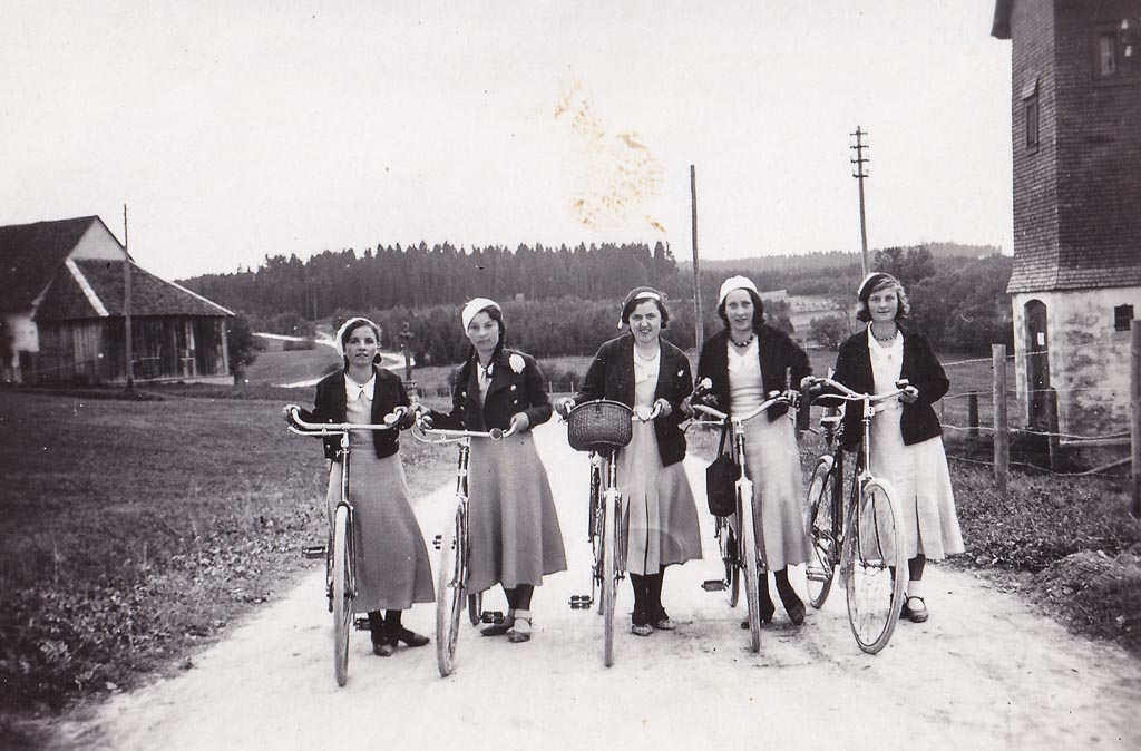 Die Freundinnen tragen Röcke und Jacken. Die Räder sind schwer, die Strecke zieht noch einmal an. Bis hinauf zur Anhöhe am Witterschneekreuz heißt es schieben oder kräftig in die Pedale treten. Danach wird es leicht, dann rollt der Weg fast von selbst bergab. Zeit zum Durchatmen, für Gespräche und gemeinsames Lachen. Das Foto hält einen unbeschwerten Moment ihrer Freundschaft fest. Ein Ausflug wie dieser bedeutet auch Abwechslung vom Alltag und ein Stück Freiheit.