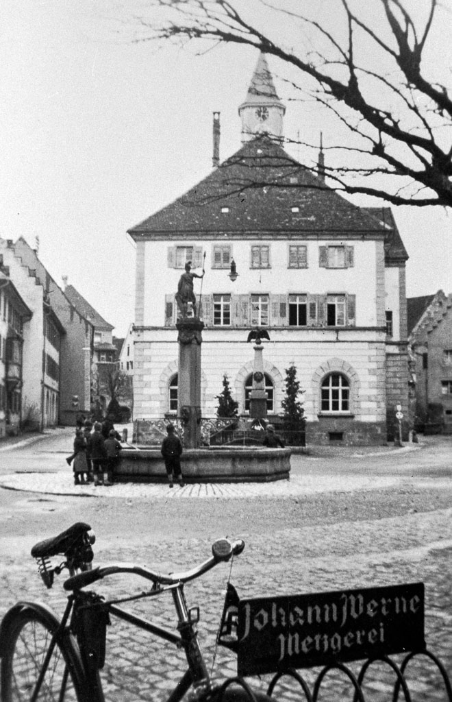Im Vordergrund rahmt ein abgestelltes Fahrrad die Szene. Es steht in einem einfachen Ständer, daran ein Schild mit der Aufschrift »Johann Werne Metzgerei«. Mobilität ist noch überschaubar, vieles spielt sich zu Fuß oder mit dem Rad ab. 1957 wird die »Werne-Metzgerei« von Willy Butsch (1913-1991) und seiner Ehefrau Emma Butsch (geb. Satler, 1911-2006) übernommen. Wenn man genau hinschaut, kann man an dem Fahrrad einen Wimpel mit dem nationalsozialistischen Hakenkreuz erkennen.