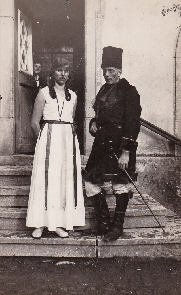 Alma Egle trägt ein helles, langes Kleid mit dunklen Bändern und geflochtenen Zöpfen – ihr Kostüm soll an eine Tänzerin aus dem Osten Europas erinnern. Neben ihr steht Fritz Adrion in einer pelzbesetzten Uniform mit hoher Mütze, Stiefeln und Stock: eine Figur, die an einen Offizier oder Zarenhofbeamten denken lässt. Zusammen verkörpern sie die Hauptfiguren ihrer Gruppe und geben den Ton für den Auftritt vor.